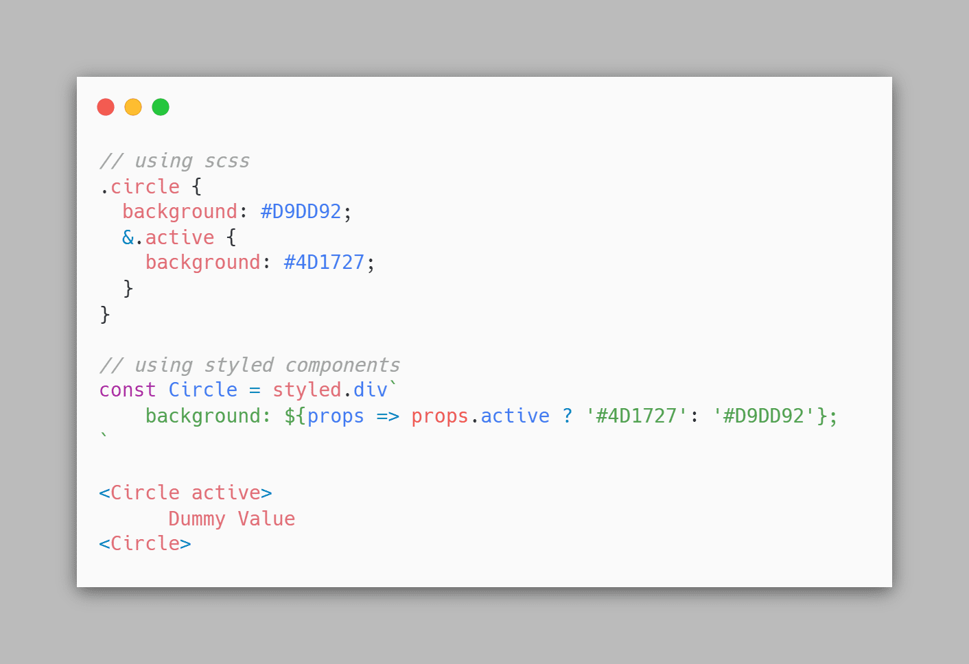 As we know we can pass props in styled components this is where the power comes in. In below example, we are discussing how we can write dynamic styles on the basis of props.